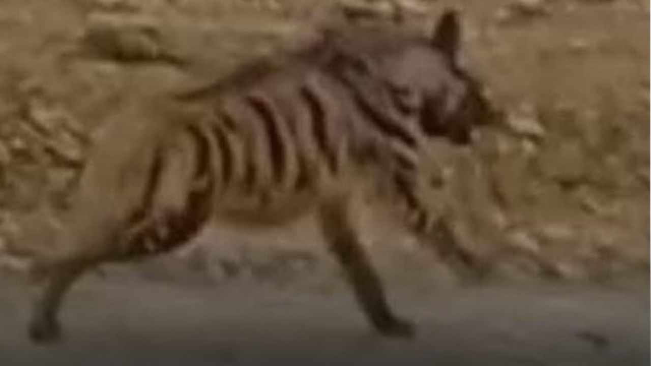 Görüntülerde, çizgili sırtlan yolun karşısına geçerken görülüyor ve bir süre sonra gözden kayboluyor.