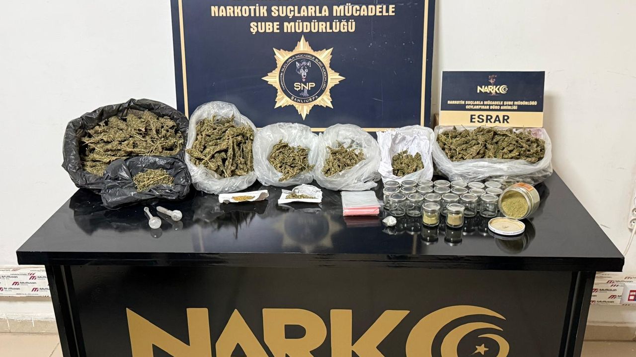 Adreste yapılan aramada, 1 kilo 739 gram esrar, kavanozlar içerisine konulmuş 439 gram toz esrar, 10 gram tütüne karıştırılmış esrar, 2 büyük cam kavanoz, 20 küçük cam kavanoz ele geçirildi.