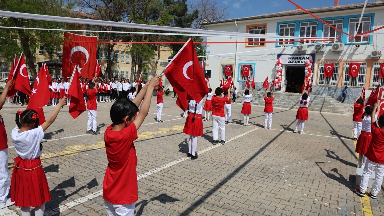Harran İlkokulu’nda gerçekleştirilen kutlama programı, öğrenci, öğretmen ve velilerin yoğun katılımıyla adeta bir bayram şölenine dönüştü.