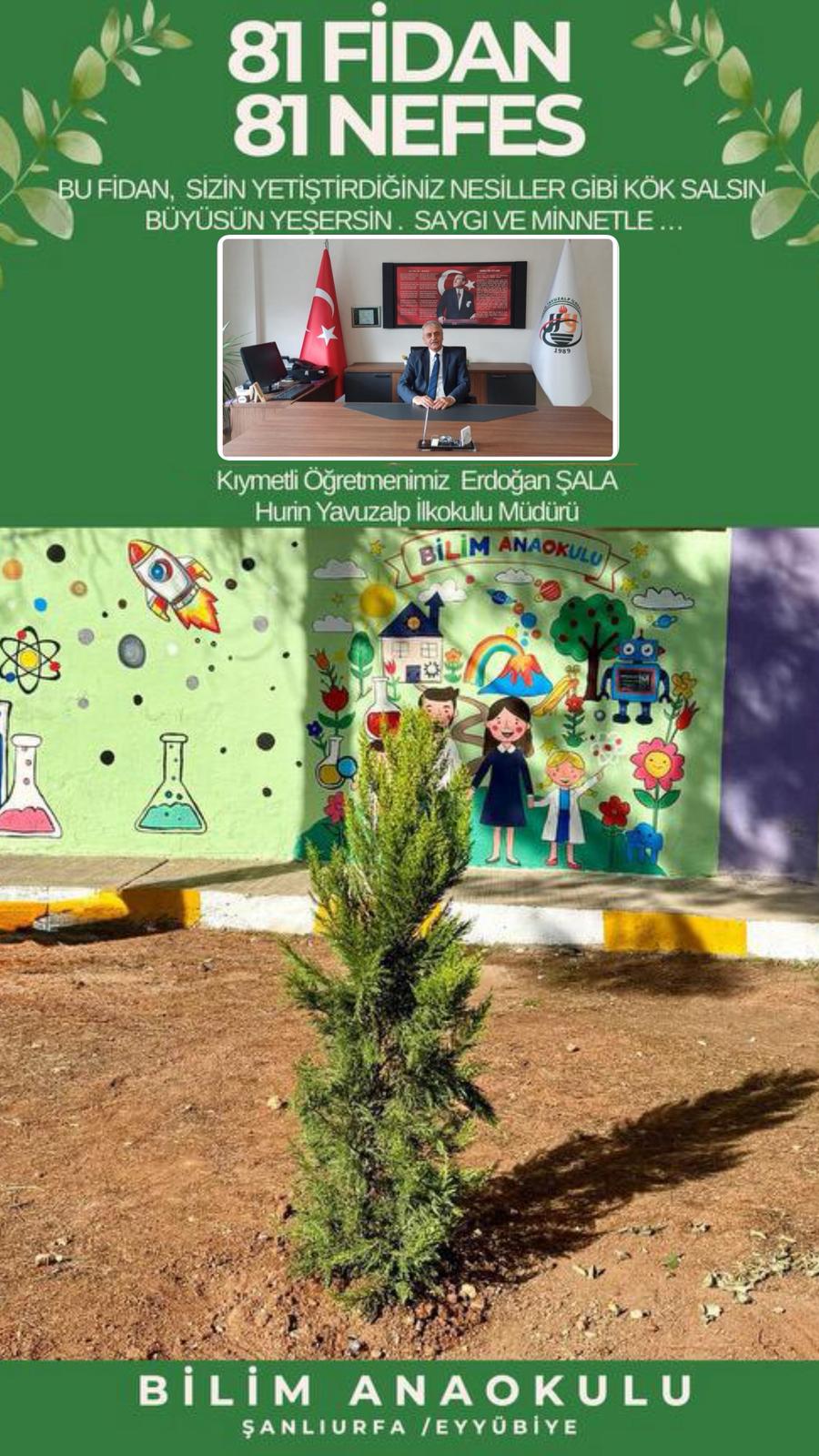 81 ilde eğitimciler için dikilen vefa fidanlarından biri de, Bilim Anaokulu bahçesinde toprakla buluşturuldu. Haziran ayında emekli olacak olan Erdoğan Şal için yapılan bu özel jest, sadece öğretmenlere duyulan minnettarlığın bir ifadesi değil, aynı zamanda doğaya ve geleceğe duyulan sorumluluğun da bir simgesi olarak dikkat çekiyor.