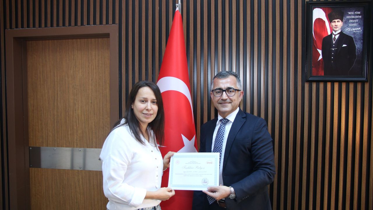 Başhekim Dr. Murat Halitoğlu ve hastane idaresi, Dr. Derya Uyan Hendem’e hizmetlerinden dolayı teşekkür belgesi takdim etti.