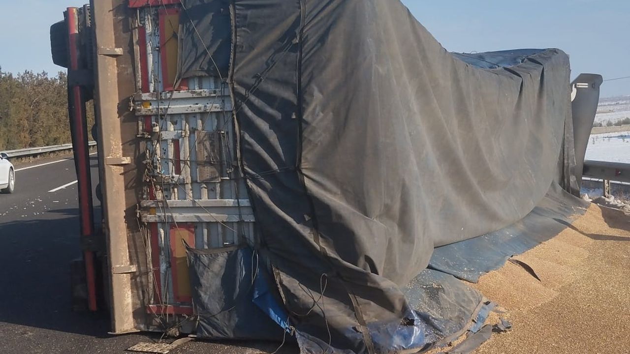 Yola savrulan buğdaylar başka bir araçla nakledilirken, devrilen tır iş makinesi yardımıyla kaldırıldı.