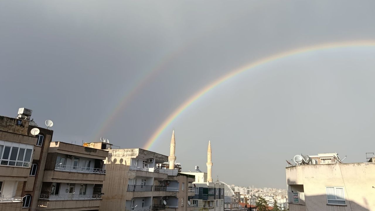 Kentte Cuma günü öğle saatlerinde etkili olan yağışın ardından beliren çifte gökkuşağı, vatandaşlara bayram ve Cuma sevinciyle birlikte üçüncü bir sürpriz yaşattı. Renk cümbüşüne dönüşen gökyüzü, cep telefonu kameralarıyla kaydedildi.
