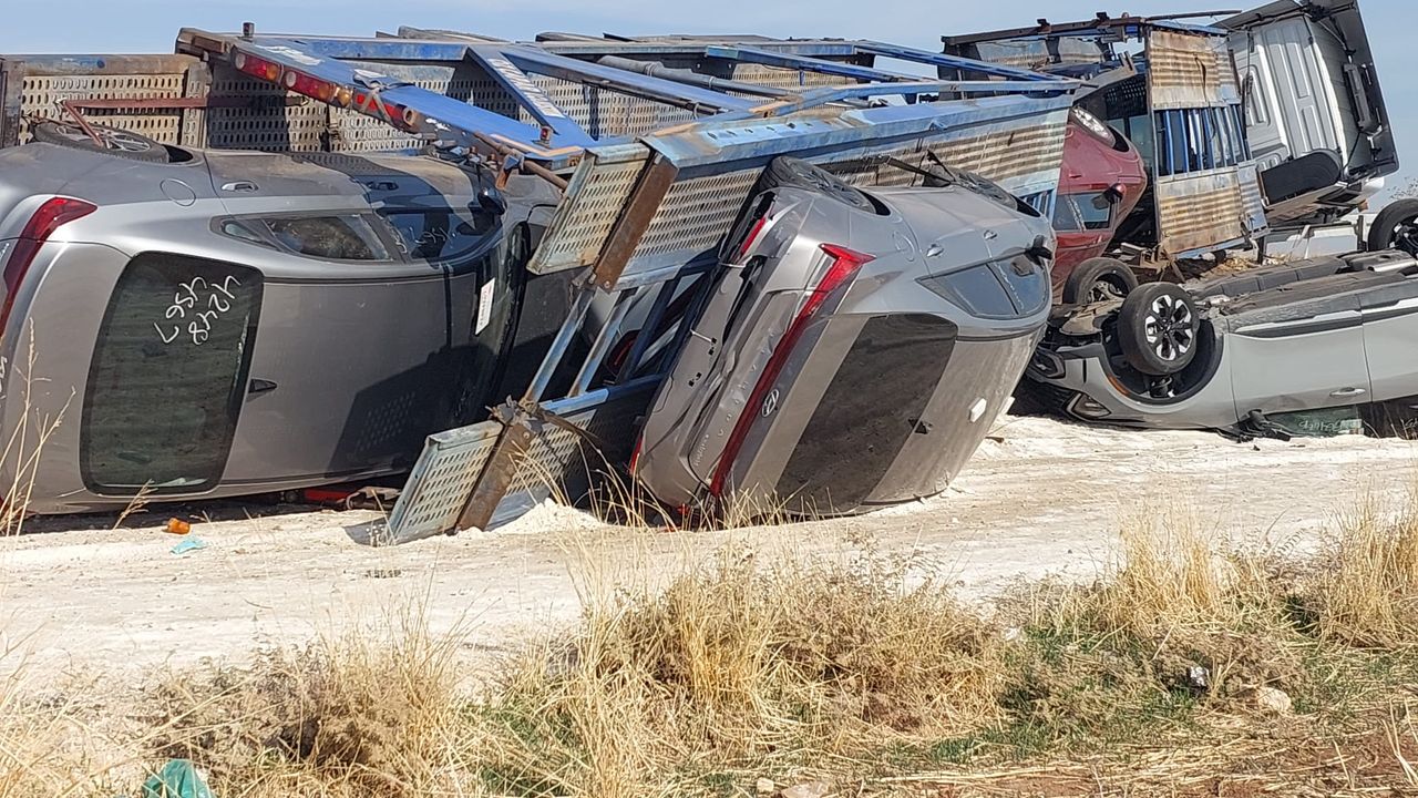 Devrilmenin etkisiyle TIR’ın üzerinde bulunan sıfır otomobiller ciddi şekilde hasar gördü ve büyük bölümü kullanılamaz hale geldi.