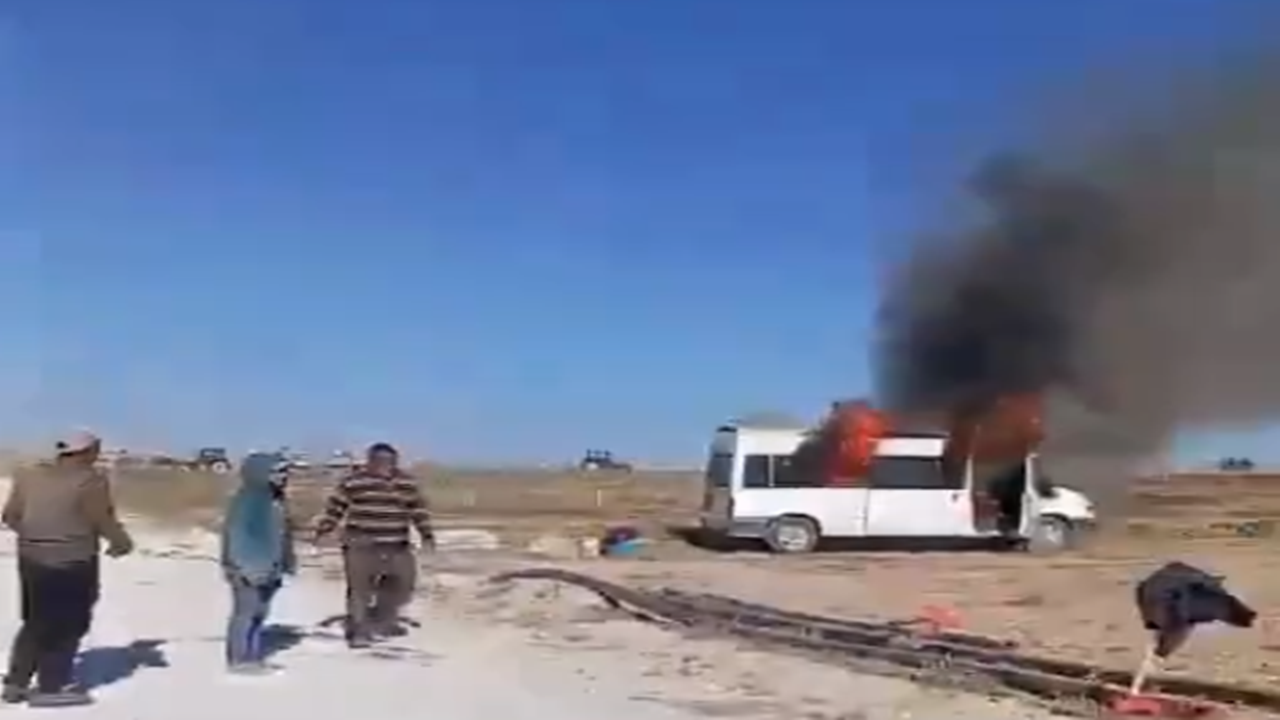 Edinilen bilgilere göre, Halil Bozkurt’a ait minibüs henüz belirlenemeyen bir nedenle yanmaya başladı. Kısa sürede büyüyen alevler, aracı tamamen sardı.